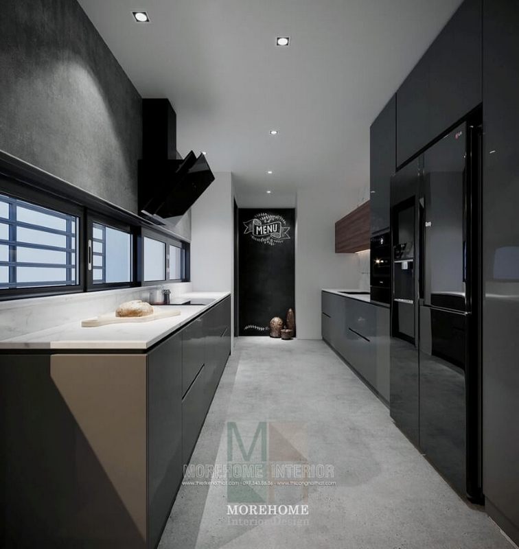 Thiết kế nội thất phòng bếp theo phong cách hiện đại bằng cách sử dụng các tông màu đối xứng với nhau.
