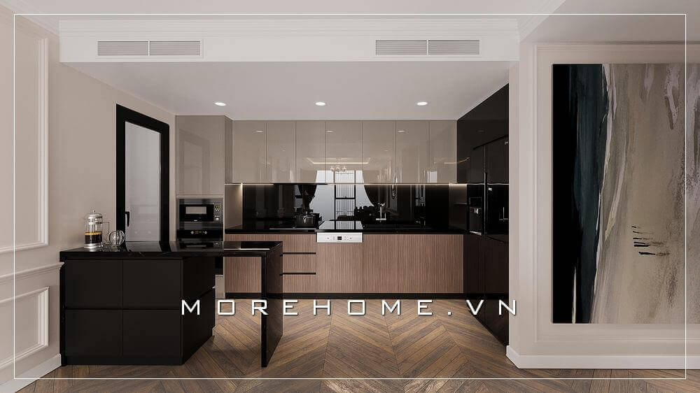 Mẫu tủ bếp gỗ công nghiệp, mặt bếp ốp đá màu đen cao cấp cùng hệ thống bếp tiện nghi cho người nội trợ