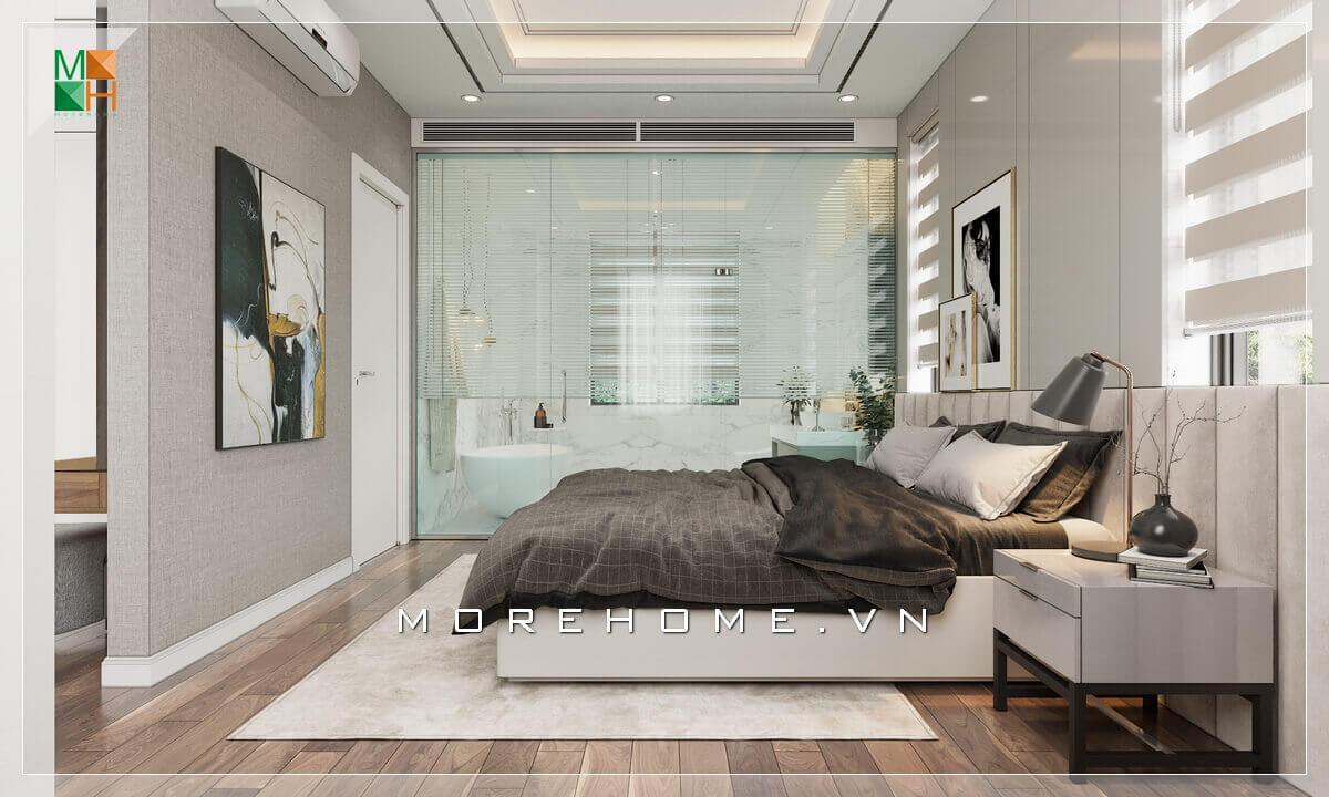 Thiết kế tấm vách kính cao cấp ngăn cách giữa phòng ngủ và nhà vệ sinh.