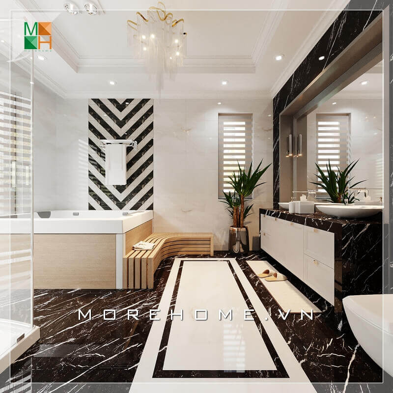 Mẫu thiết kế phòng tắm cao cấp mang vẻ đẹp sang trọng sử dụng đá ốp tường và lát sàn ấn tượng phù hợp cho không gian của biệt thự, nhà phố